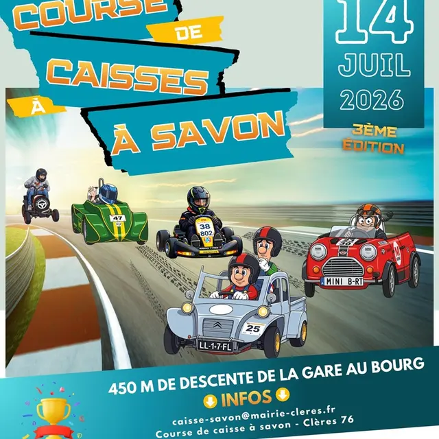 Ce mardi 14 juillet, venez assister à la 3ème édition des Courses de caisses à savon de Clères ! De 9h30 à 11h30, les pilotes feront leur descente d’essai. - 13h30 : 1ère descente - 15h00 : 2ème descente - 16h00 : 3ème descente Et à 18h, les chauffeurs recevront leurs prix ! Restauration / buvette sur place et nombreuses animations ! Enfant âgé de 8 ans minimum obligatoirement accompagné par un adulte (catégorie folklorique)