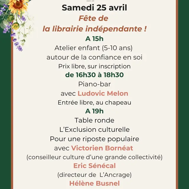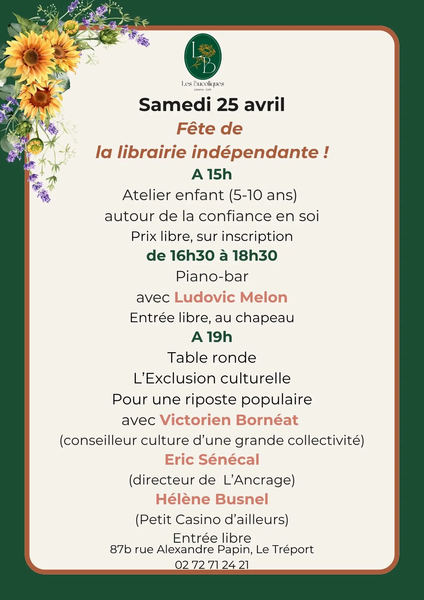 Dans le cadre de la fête de la librairie indépendante, Les Bucoliques vous proposent : - A 15h : Atelier enfant autour de la confiance en soi(5/10 ans). Prix libre, sur inscription. - De 16h30 à 18h30 : Piano - bar avec Ludovic Melon. Entrée libre au chapeau. - A 19h : Table ronde autour du thème "L'exclusion culturelle, pour une riposte populaire. Avec Victorien Bornéat, Eric Sénécal, Hélène Busnel. Entrée libre.