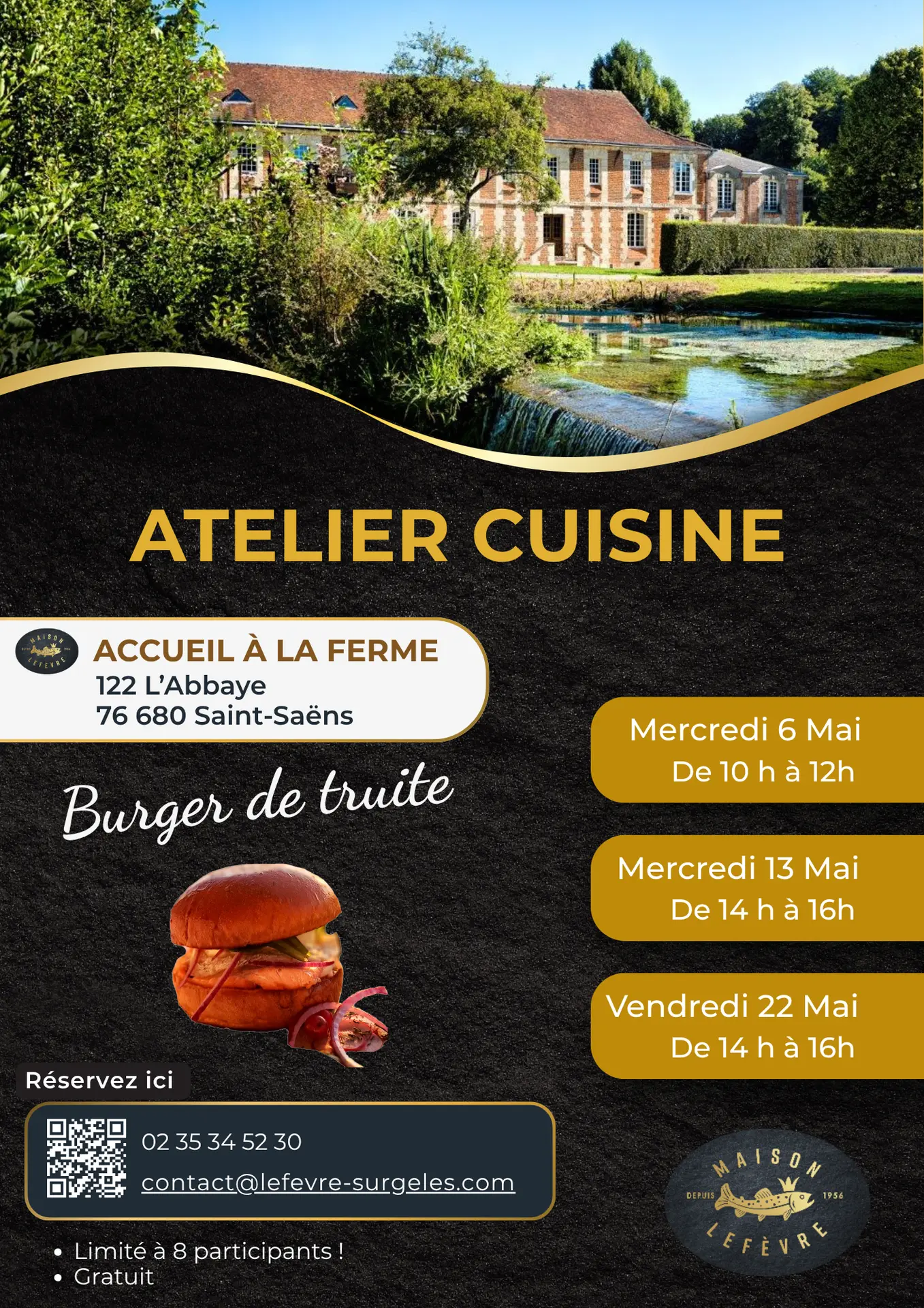 Pour le mois de mai, la Maison Lefevre va sublimer ses filets de truite avec un burger pas comme les autres et propose plusieurs ateliers cuisine. Places limitées. Lien d'inscription : https://forms.office.com/r/W1BjrDRCwt