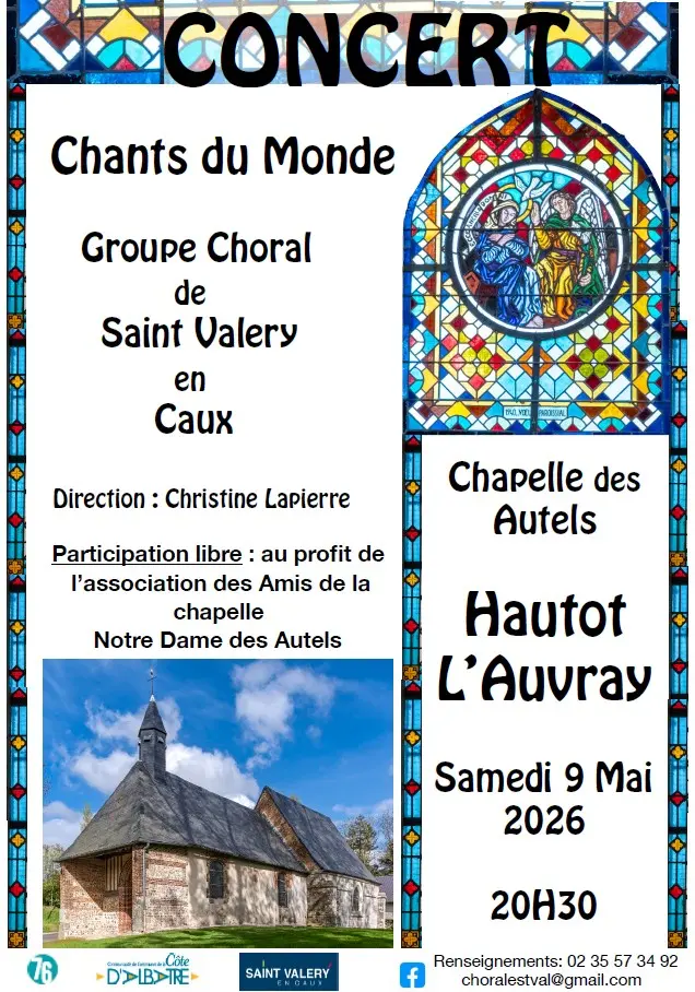 L’association des amis de la chapelle Notre-Dame des Autels d’Hautot l’Auvray ac-cueillera le Groupe Choral de Saint-Valéry en Caux, le samedi 9 mai prochain, à 20 heures 30, pour un concert exceptionnel.