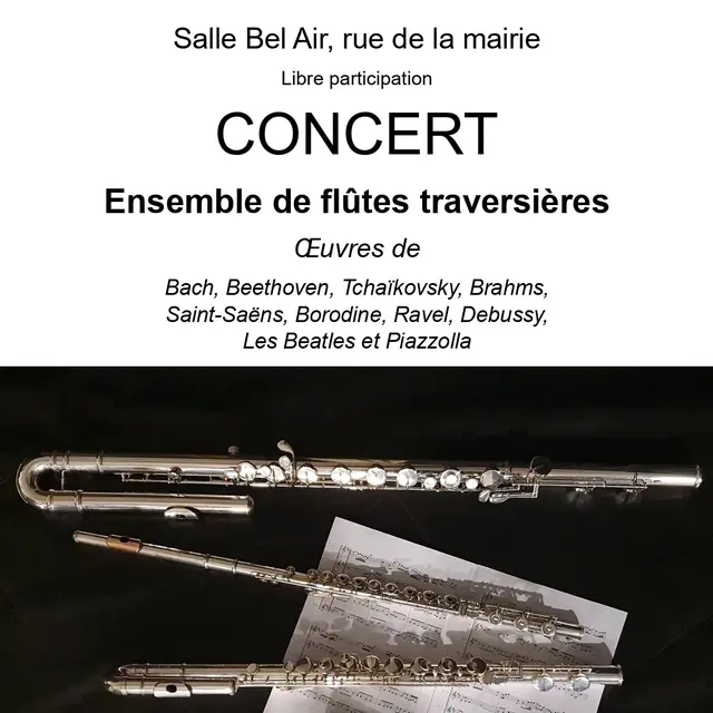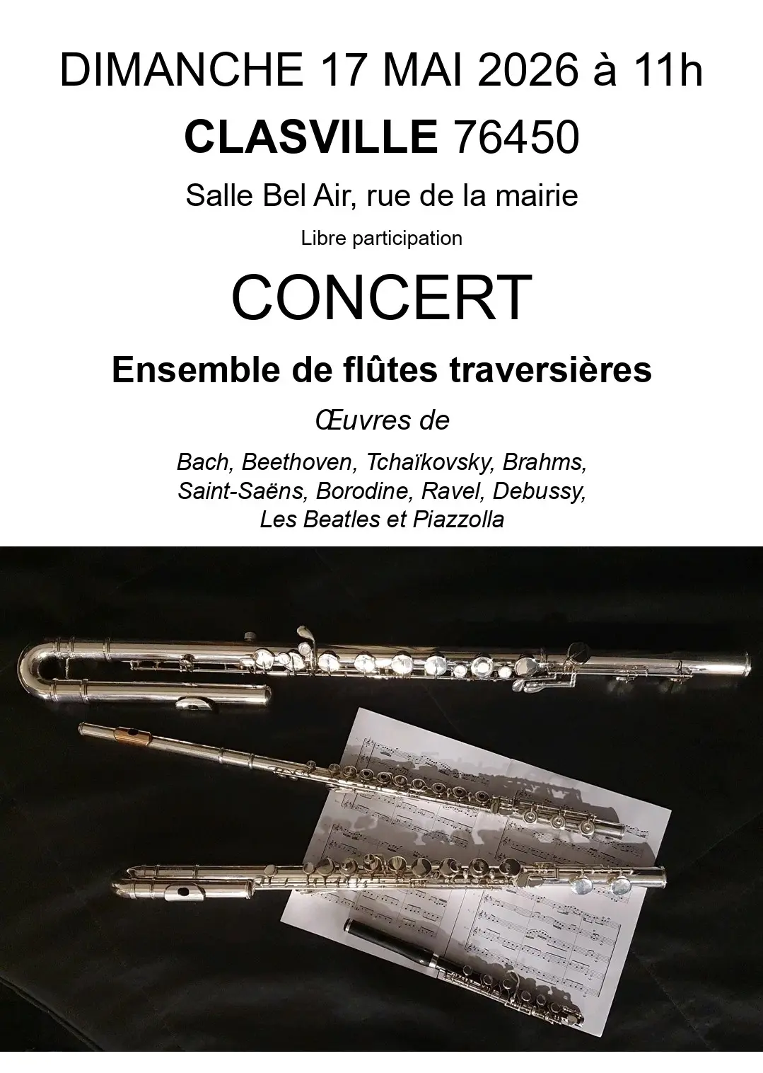Un concert d’ensemble de flûtes traversières se tiendra le 17 mai à 11h à la salle Bel Air de Clasville. Le programme proposera des œuvres de grands compositeurs tels que Bach, Beethoven et Tchaïkovsky, ainsi que d’autres pièces variées. L’entrée se fera sur participation libre, offrant à chacun la possibilité de profiter de ce moment musical.
