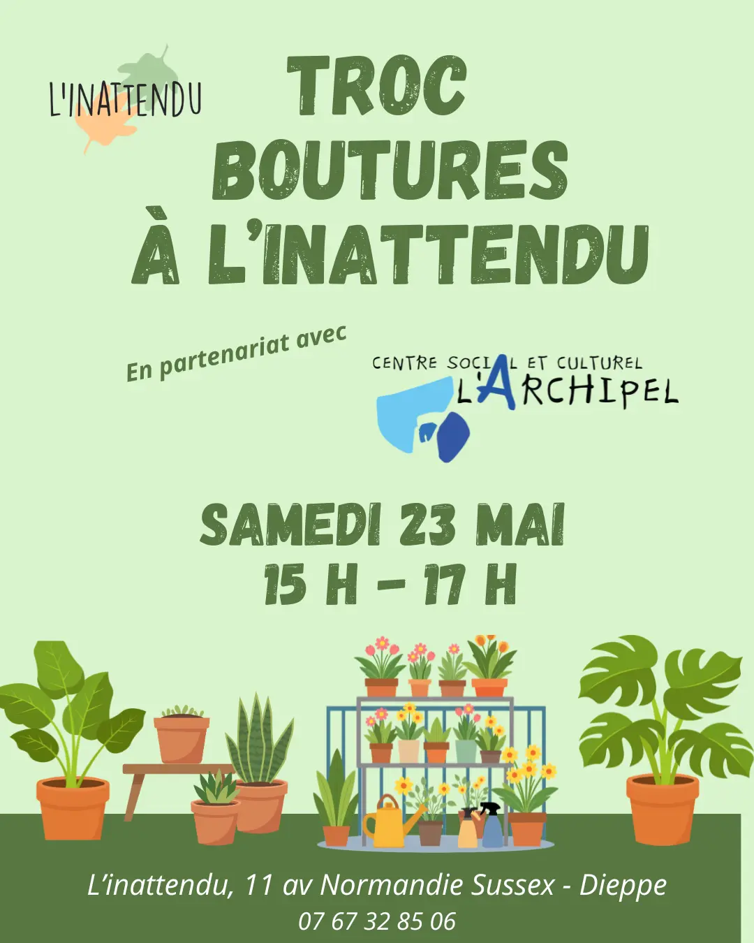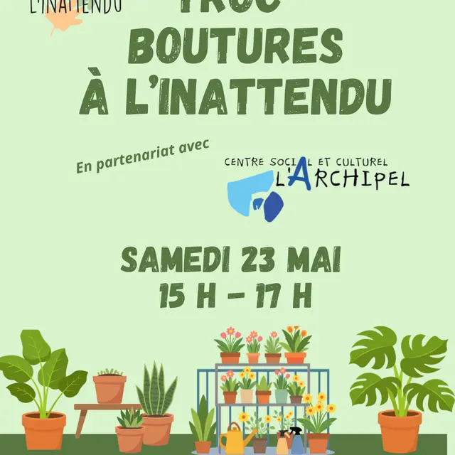 Organisé par L’Inattendu en partenariat avec le centre social L’Archipel, ce premier troc de boutures promet de ravir les amateurs de plantes 🌿 Venez échanger vos boutures, découvrir de nouvelles variétés et partager vos conseils dans une ambiance conviviale et chaleureuse. Un moment de partage idéal pour les passionnés comme pour les curieux 🌼