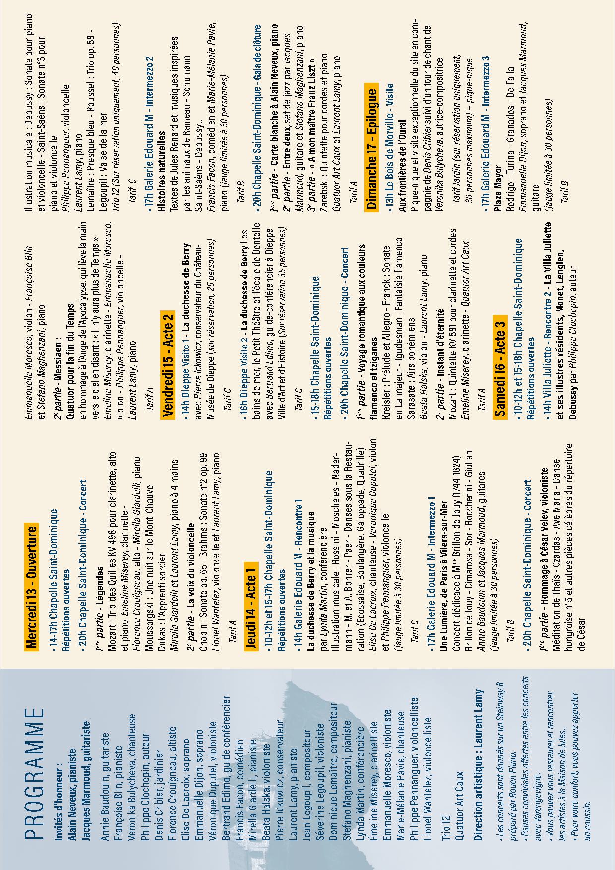 Alain Neveux (pianiste) et Jacques Marmoud (guitariste) seront les figures majeures de cette édition, accompagnés de nombreux artistes tels que Beata Halska (violon), Mirella Giardelli (piano), Emeline Miserey (clarinette) ou encore Lionel Wantelez (violoncelle).