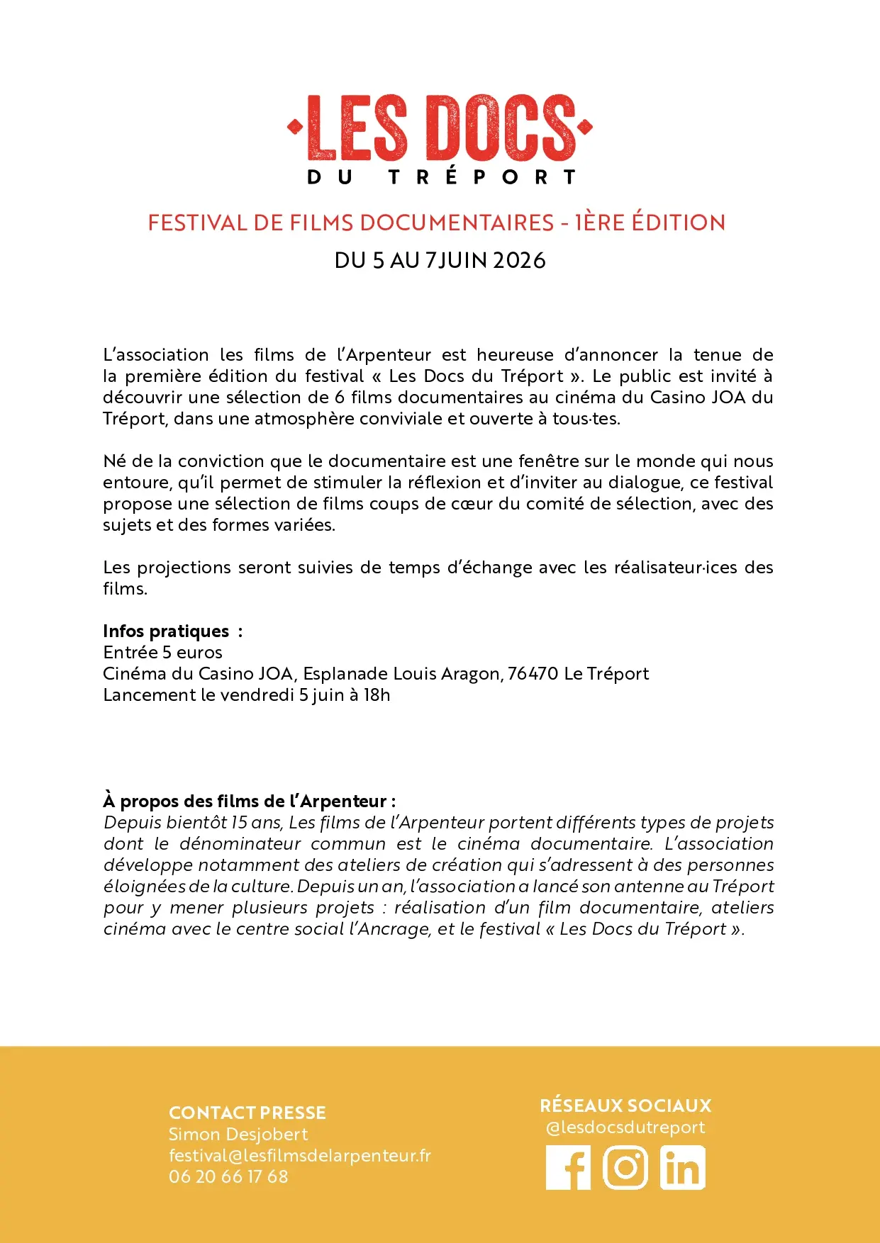 1ère édition du festival « Les Docs du Tréport ». Le public est invité à découvrir une sélection de 7 films documentaires, dans une atmosphère conviviale et ouverte à tous·tes.