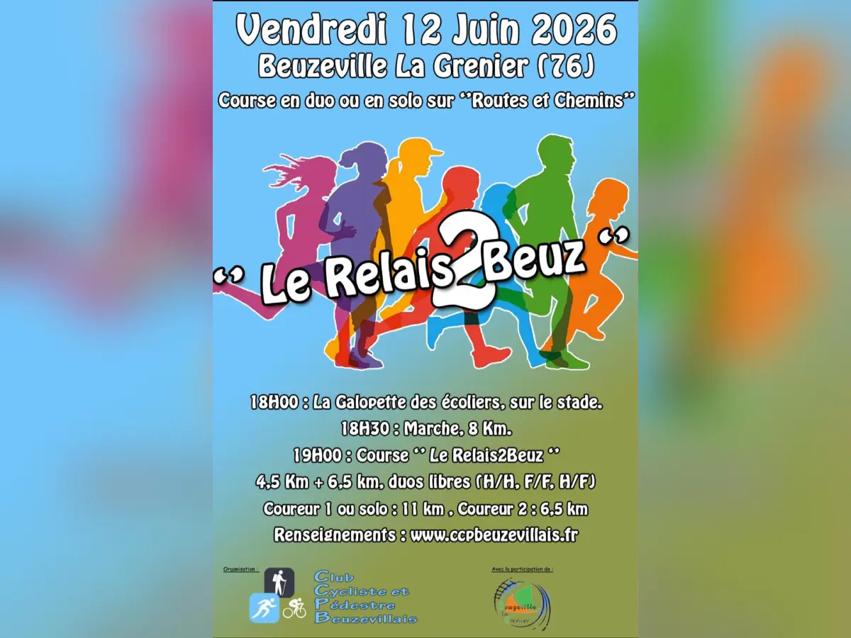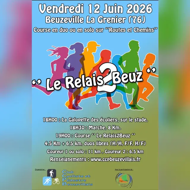 Nous vous donnons rendez vous le vendredi 12 juin pour le Relais2Beuz Au programme: -18h00 les courses enfants de 6 à 11 ans -18h30 départ de la marche de 8km -19h00 départ du Relais2Beuz En duo (1er coureur 4.5km+6.5km, 2e coureur 6.5km) ou en individuel Parcours sur route et chemin Nous vous attendons nombreuses et nombreux. (Pas de coureurs sans PPS ou licence.)