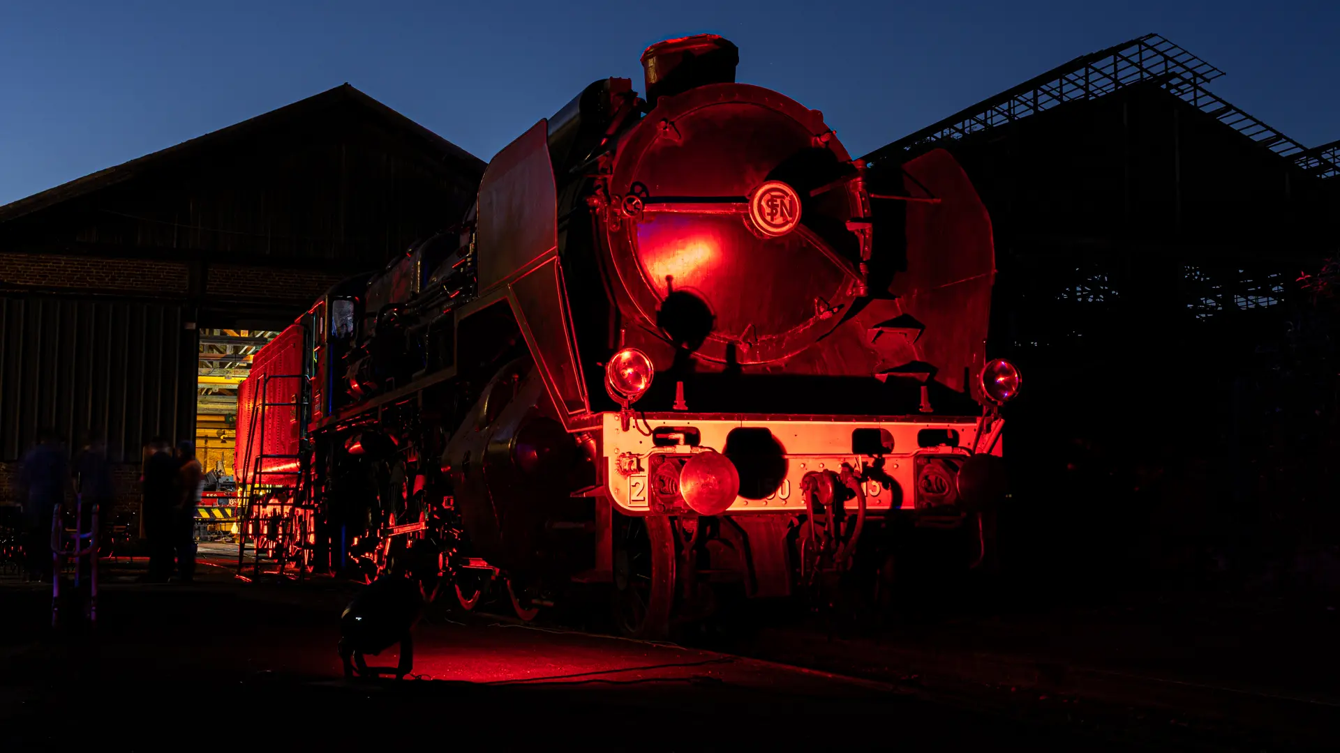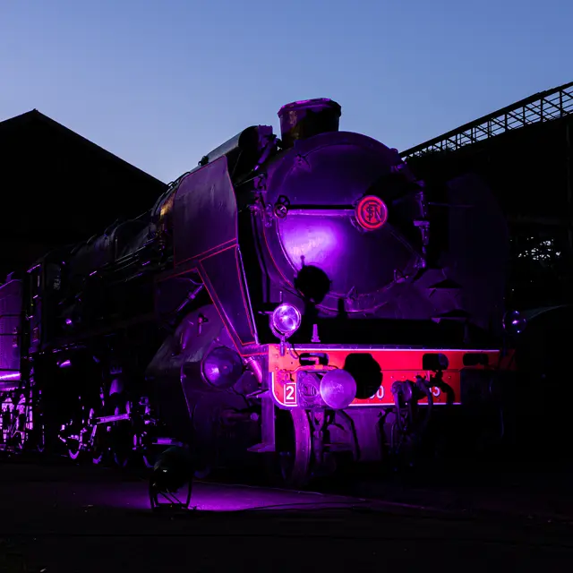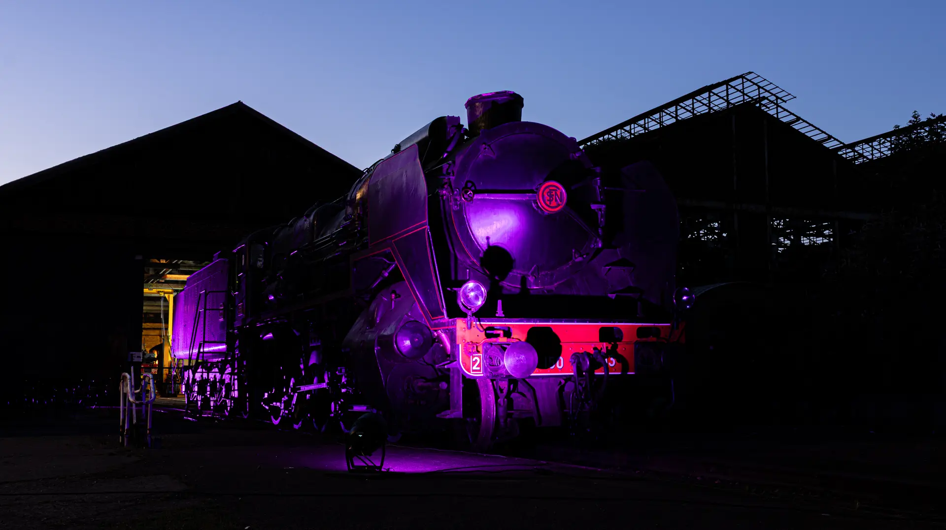 Mise en lumière de nos ateliers, nos voitures et notre locomotive à vapeur dès la tombée de la nuit!