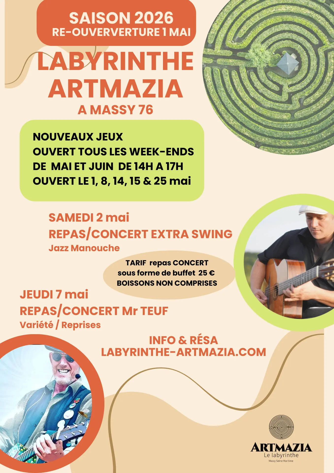 - Le samedi 2 mai : concert de jazz manouche EXTRA SWING - Repas concert : 25 € (buffet froid).