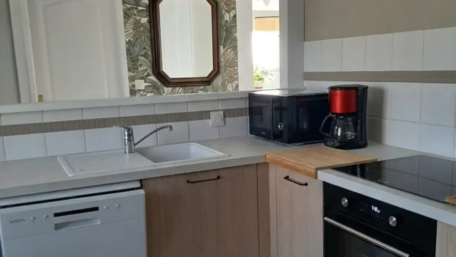 ? ausgestattete Küche: Induktionskochfelder, Backofen, Mikrowelle, Geschirrspüler und Kühl-Gefrierkombination.