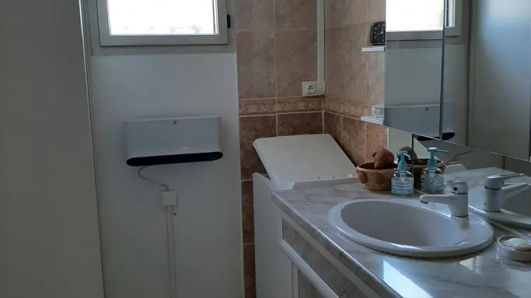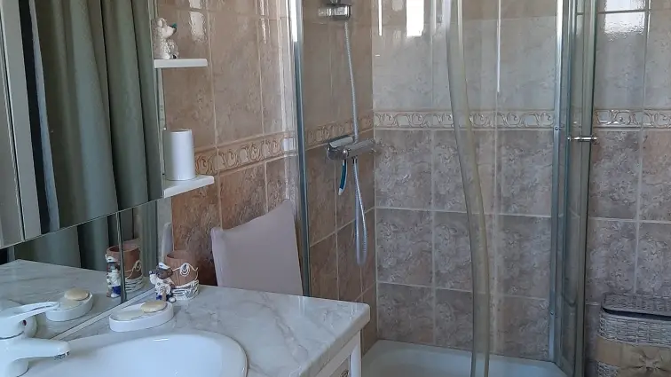 badezimmer: Dusche, Waschbeckenschrank mit Ablage, Waschmaschine. Handtücher und Badetücher werden gestellt.