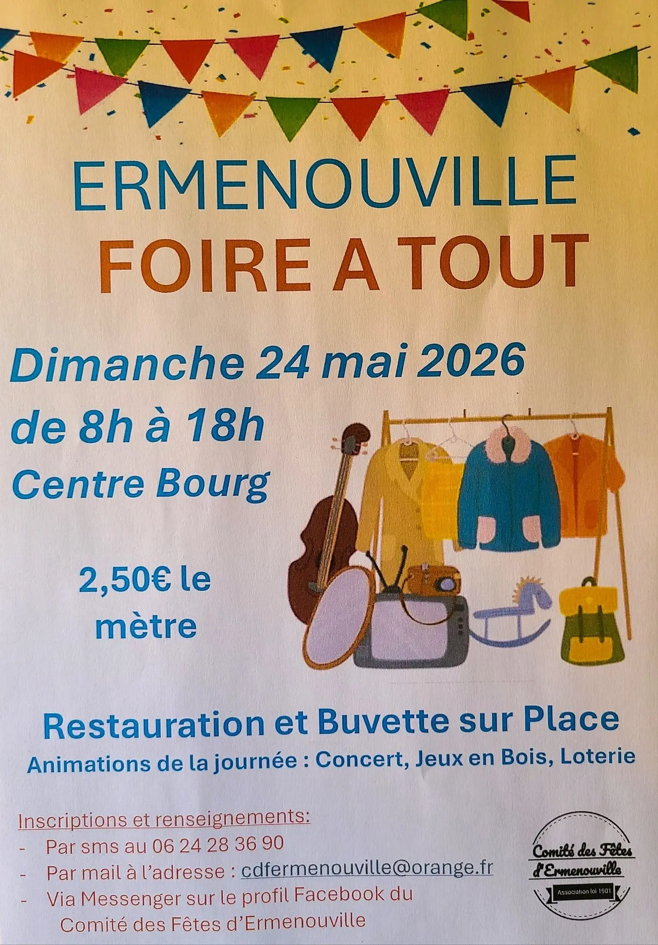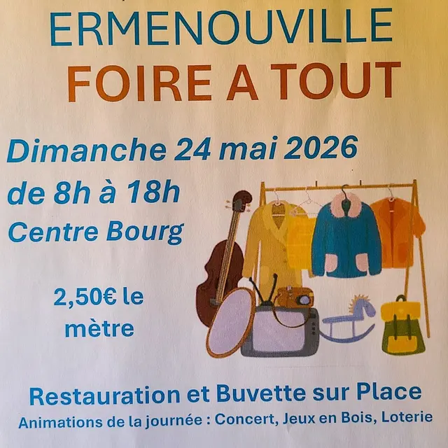 Foire à tout dans le centre bourg de 8h à 18h. Restauration sur place, buvette. Animations dans la journée : concert, jeux en bois, loterie... Exposants: 2.50€/m