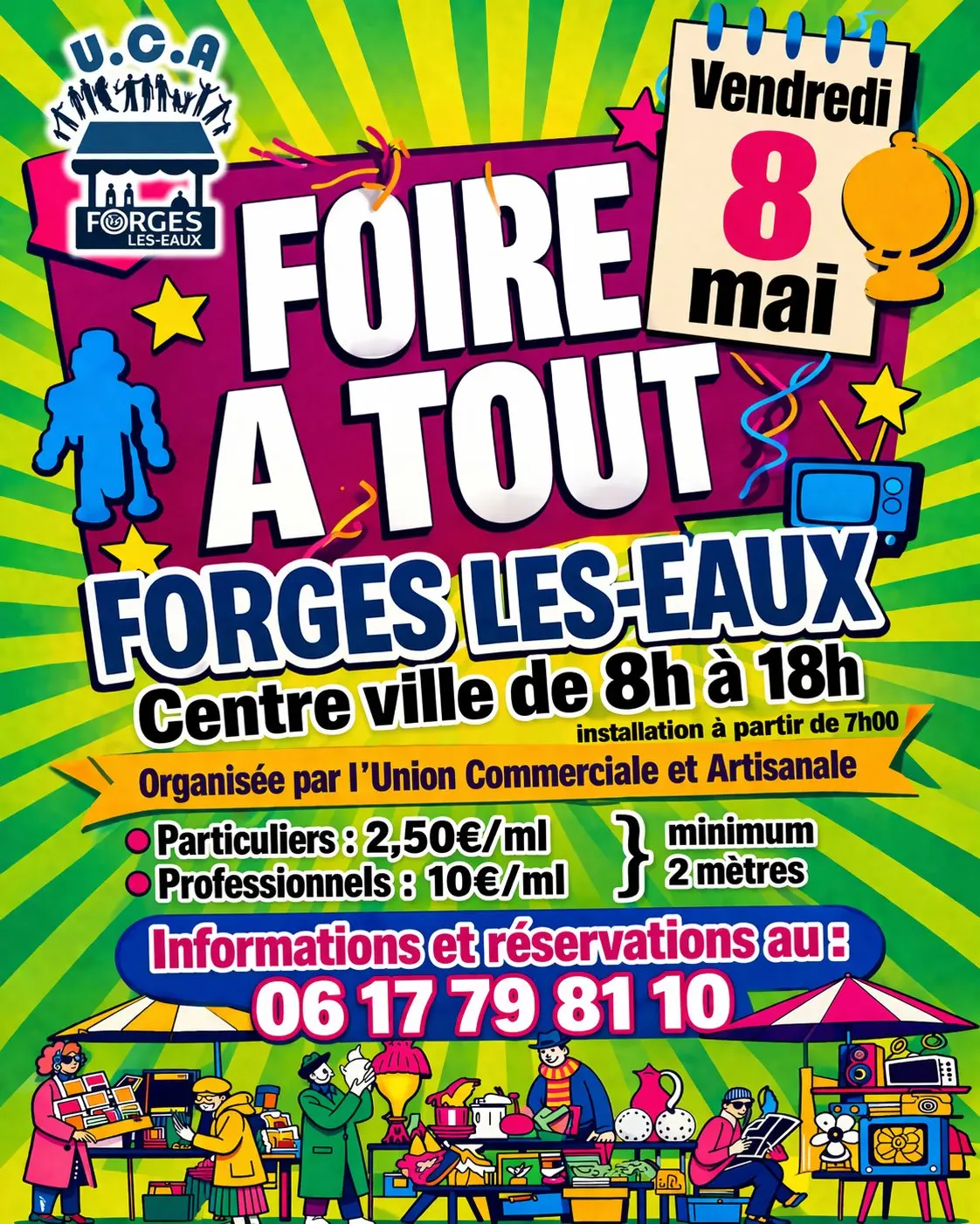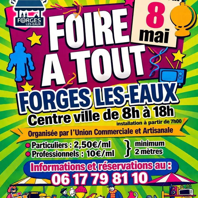 L' Union Commerciale et Artisanale de Forges les Eaux organise une foire à tout 📆 VENDREDI 8 MAI 2026 📍 en centre de ville de FORGES-LES EAUX Infos et réservations au 📞06 17 79 81 10