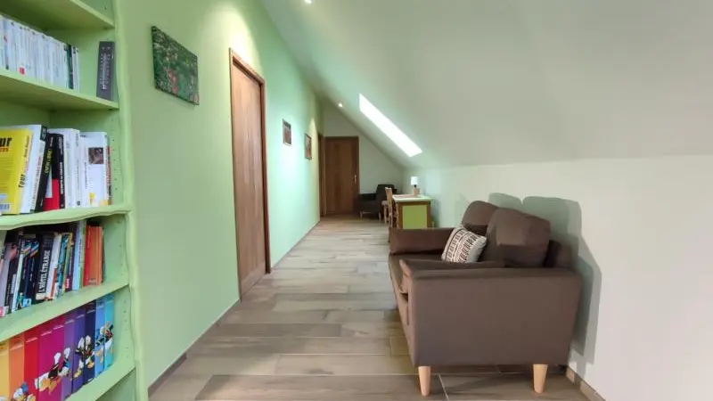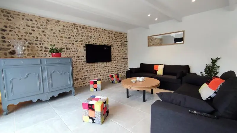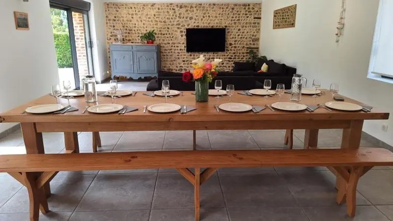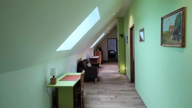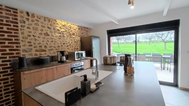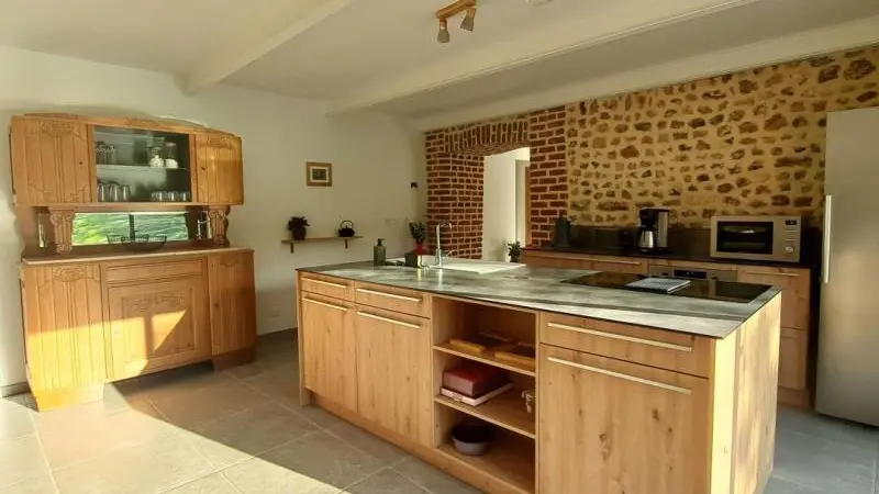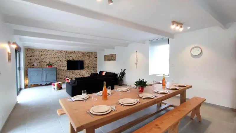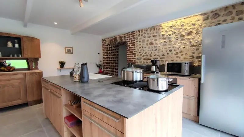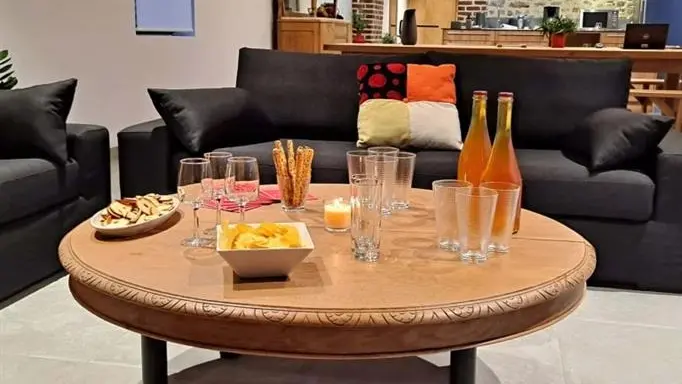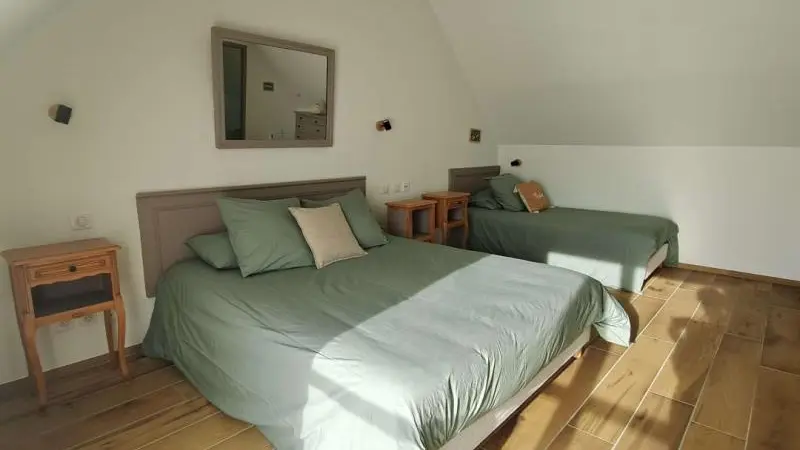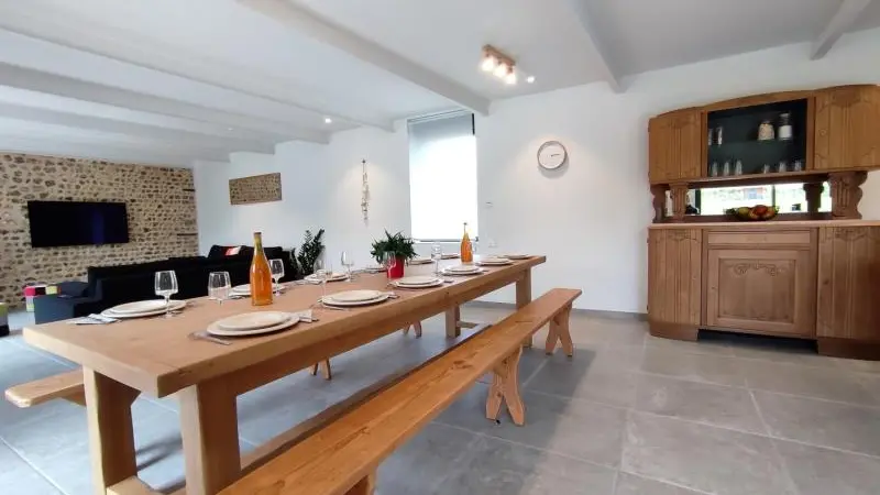 Rez-de-chaussée : - entrée, Grande pièce de vie de 60 m² avec : - cuisine en îlot central (plaque induction 4 feux aspirante, lave-vaisselle, réfrigérateur, micro-ondes, four), - espace-repas : grande table de ferme, - espace salon : « buffet à jeux », canapés confortables et TV 140cm Android, - chambre 1 lit 2 personnes lit 160x200cm ouverte sur le jacuzzi extérieur avec salle d'eau privative (douche 140x90cm, wc), - buanderie : lave-linge, sèche-linge, réfrigérateur/congélateur, étendage, - wc A l'étage : - espace de lecture et de travail (bureau, canapé, bibliothèque), - La chambre du verger : 4 lits 1 personne 90x200cm, - La chambre du jardin : 1 lit 2 personnes 160x200cm, 1 lit 1 personne 90x190cm, - La chambre des sous-bois : 1 lit 2 personnes 160x200cm, 1 lit 1 personne 90x220cm, - salle de bain vanille : baignoire et douche (90x120cm), - salle d'eau bleue : douche 90x120cm, wc, - wc Équipement bébé : lit parapluie, chaise haute, baignoire bébé, pots, chauffe-biberon.