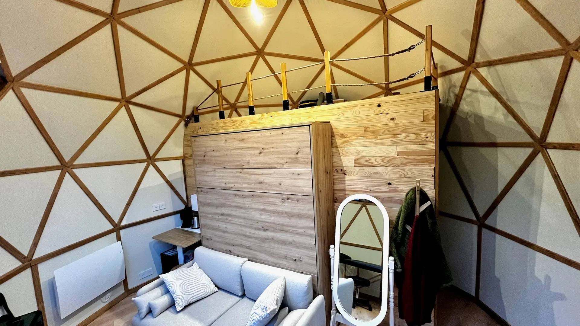 Le dôme, d’une surface de 20 m², a été pensé pour allier confort et simplicité. Son aménagement modulable permet de profiter pleinement de l’espace : un lit escamotable se transforme en sofa en journée, créant une atmosphère à la fois chaleureuse et fonctionnelle. Un coin café avec bouilloire, machine à café et mini-frigo est à votre disposition pour vos moments de pause.
